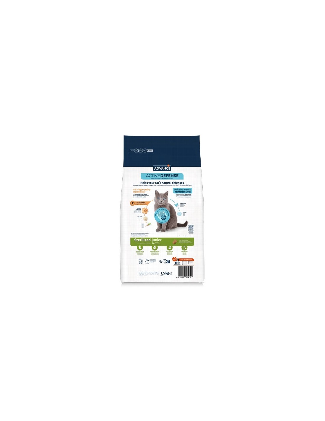 Advance Young Sterilez pollo es un alimento completo equilibrado adaptado a las necesidades nutricionales especiales de los gatos jóvenes que estén esterilizados o castrados. Las necesidades dietéticas cambian después de la esterilización; el consumo de energía se reduce en un promedio del 30%, mientras que el apetito se incrementa hasta en un 25%. Como resultado, se aumenta de peso involuntariamente lo que puede desembocar en enfermedades del tracto urinario, ya que después de la esterilización también beben menos. A esa edad, los gatos aún se están desarrollando y la demanda de alimentos es diferente que en los gatos mayores.