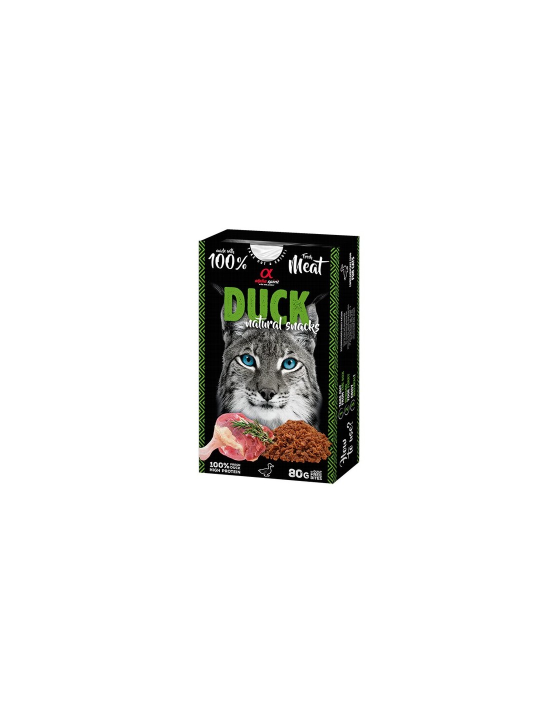 Los Alpha Spirit Snacks de Gato Natural sabor Pato son premios semihúmedos elaborados con ingredientes 100% naturales, diseñados para satisfacer el paladar exigente de tu gato mientras le proporcionan nutrientes esenciales para su bienestar. Su fórmula sin cereales ni gluten, y sin harinas cárnicas, los hace ideales para gatos con sensibilidades alimentarias. Además, están enriquecidos con taurina, un aminoácido esencial para la salud ocular y cardiovascular de los felinos.