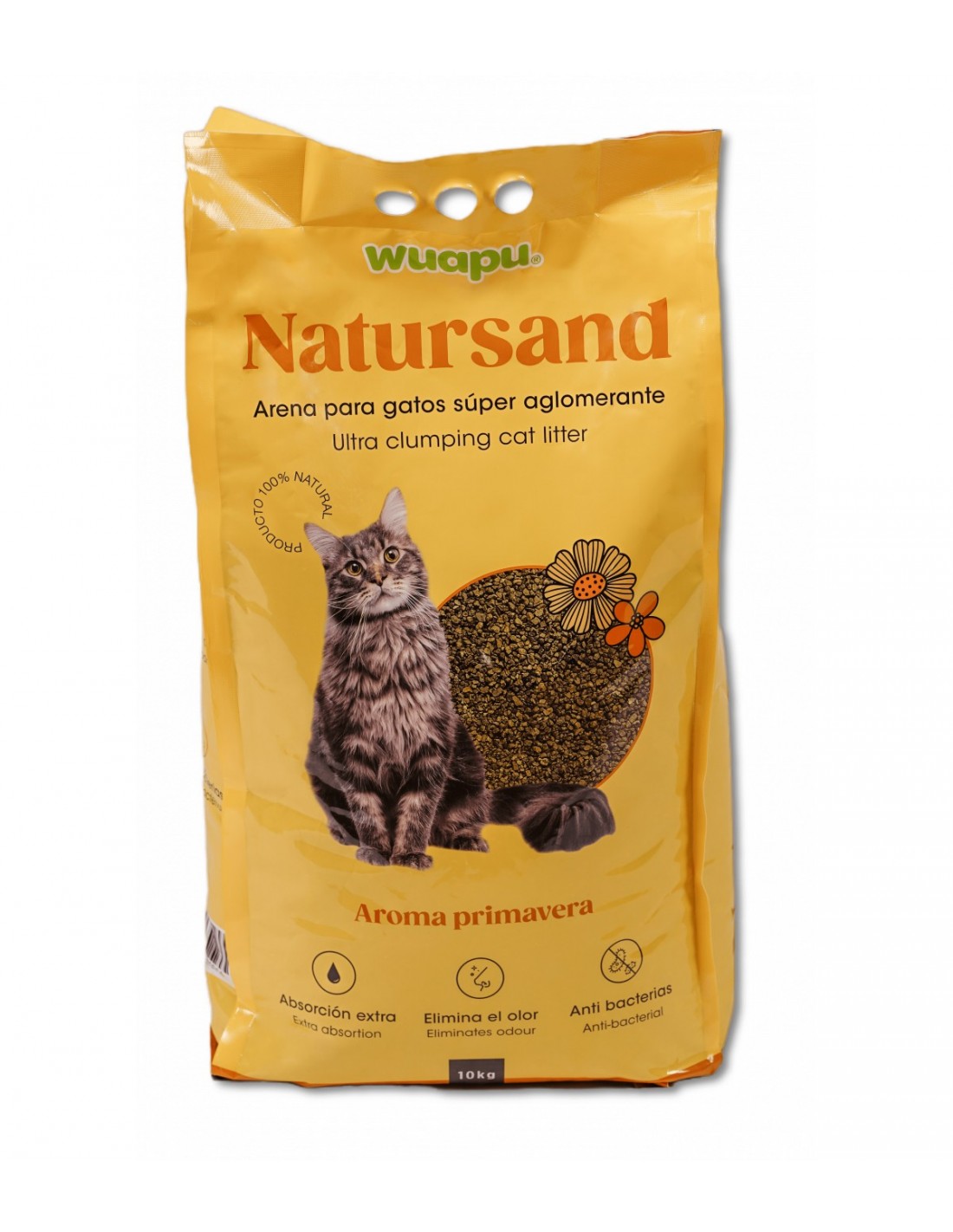 Wuapu Natursand aroma primavera es una arena aglomerante para gatos elaborada a base de bentonita rica en sodio, que tiene la propiedad de aglomerar al entrar en contacto con la orina del gato formando grumos compactos al instante fácilmente separables del resto con una paleta.