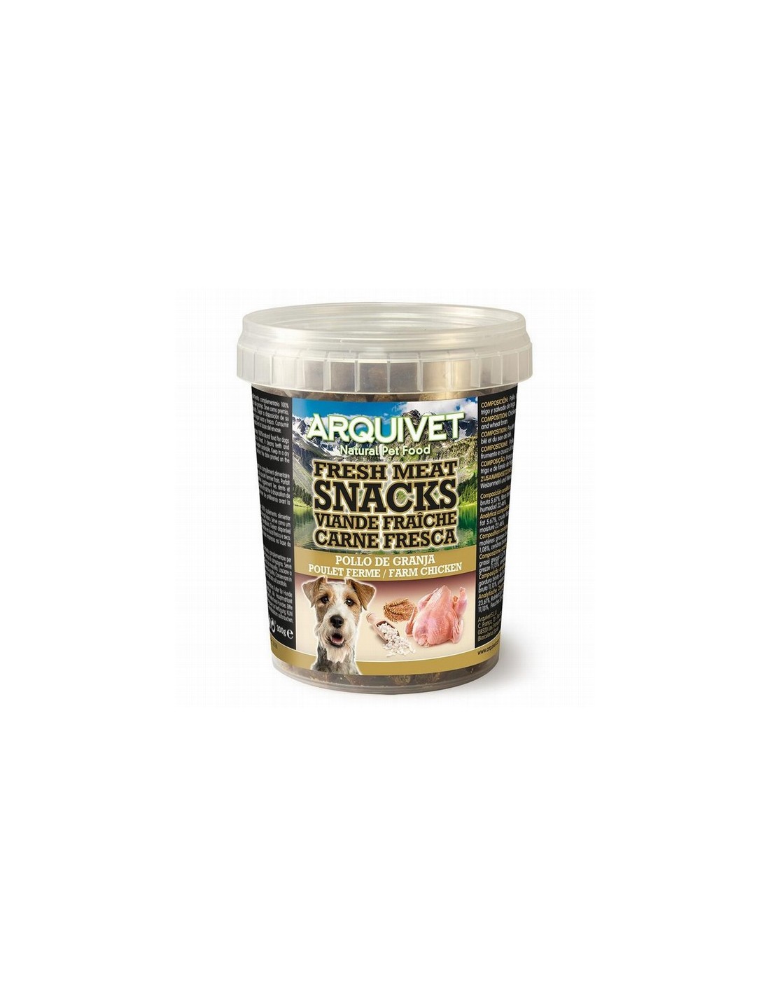 INGREDIENTES: Pollo, arroz, harina de trigo y salvado de trigo. Los Arquivet Snacks de Carne fresca, son un alimento complementario 100% natural a base de pollo fresco de granja.