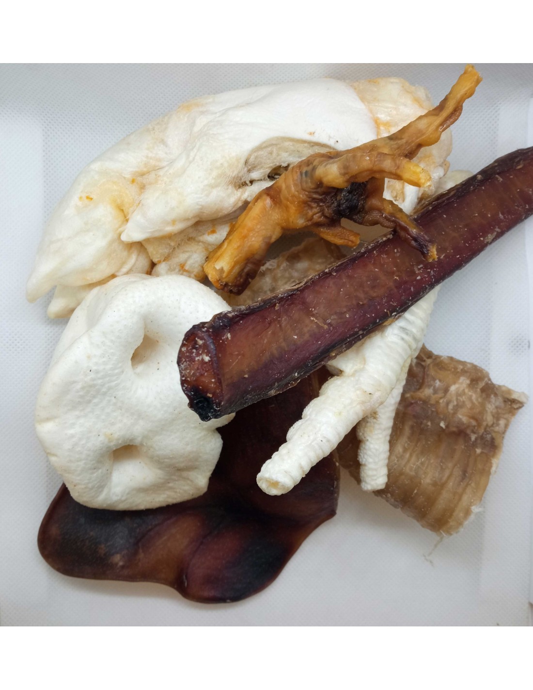 Oreja de cerdo, pie de cerdo, morro de cerdo, traquea d cerdo, nervio de buey, pulmón de ternera, pata de pollo deshidratada y pata de pollo.