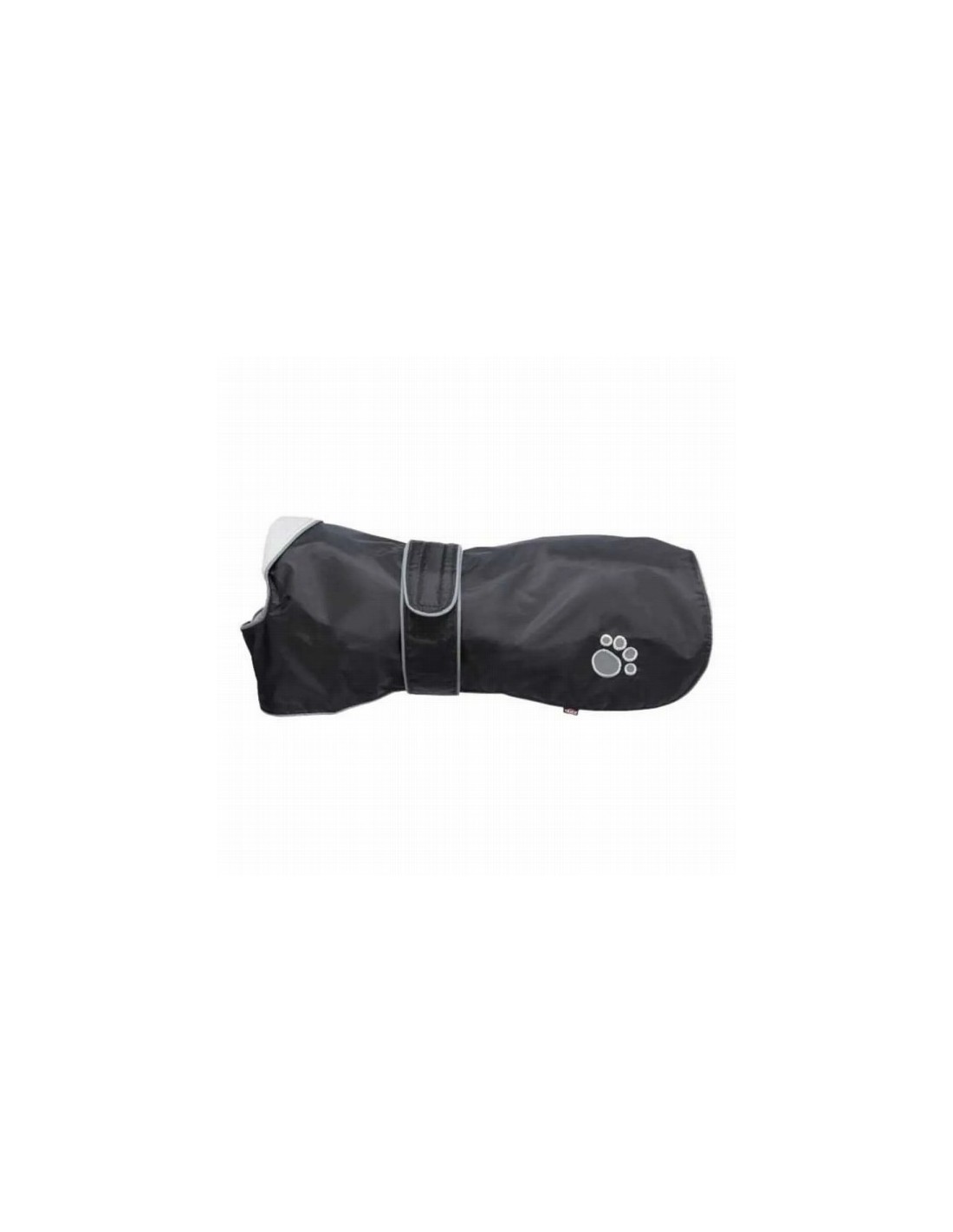 La Capa hecha de nylon de alta resistencia repela el agua y tiene un forro suave de felpa, con bandas tubulares reflectantes y estampado de huellas. Ademas las cuerdas elásticas para las patas traseras. y la sujeción de velcro en el pecho y abdomen hacen una optima sujeccion al cuerpo de perro. Muy facil de poner y de quitar. Lavable a máquina hasta 30ºC. Disponible en color negro