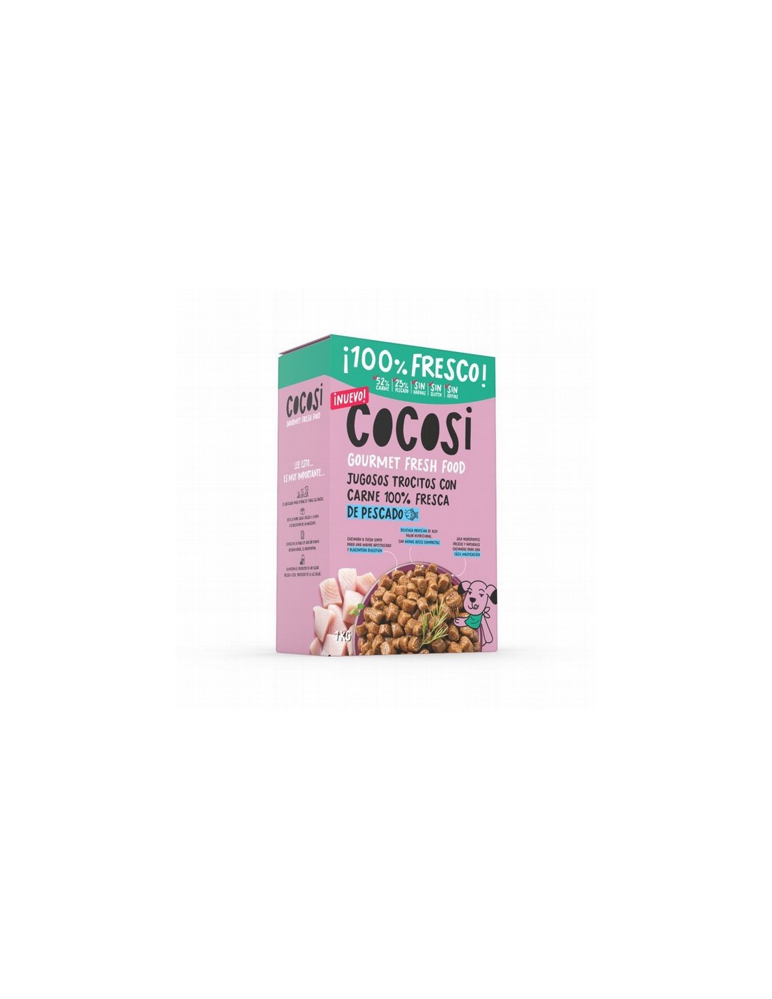 Hecho con jugosos trocitos 100% de pescado fresco. Cocinado a fuego lento para conservar lo natural, 100% ingredientes frescos y naturales. Contiene deliciosa proteína de alto valor nutricional ideal para tu mascota, 25% de proteína bruta. Obviamente, no lleva aromas ni colorantes artificiales, ni harinas de carne, ni cereal con gluten, solo jugosos trocitos de pescado.
