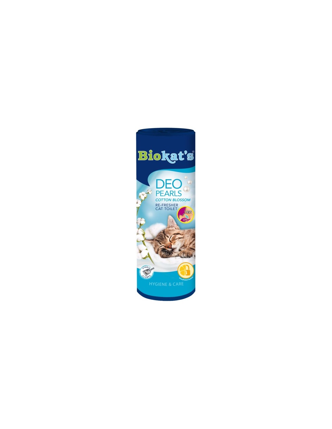 Sumérgete en nuestro mundo de fragancias y déjate seducir por una combinación armoniosa de flores de algodón y un toque discreto de jazmín. Como una suave brisa, Cotton Blossom trae una fragancia ligera y aireada de ropa recién lavada a su hogar todos los días. Deo Pearls Cotton Blossom se destaca con su AromaProtect Formula ?. Esto captura de manera confiable los olores desagradables y libera nuestra agradable fragancia Cotton Blossom. Como resultado de esto, la fórmula AromaProtect ? de Biokat, desarrollada por nuestros expertos para la higiene de los gatos, proporciona una fijación duradera del olor. Deo Pearls Cotton Blossom también fortalece la acción de aglomeración y, por lo tanto, le permite usar su arena para gatos normal durante más tiempo. Dosis recomendada: espolvoree sobre la basura según sea necesario.