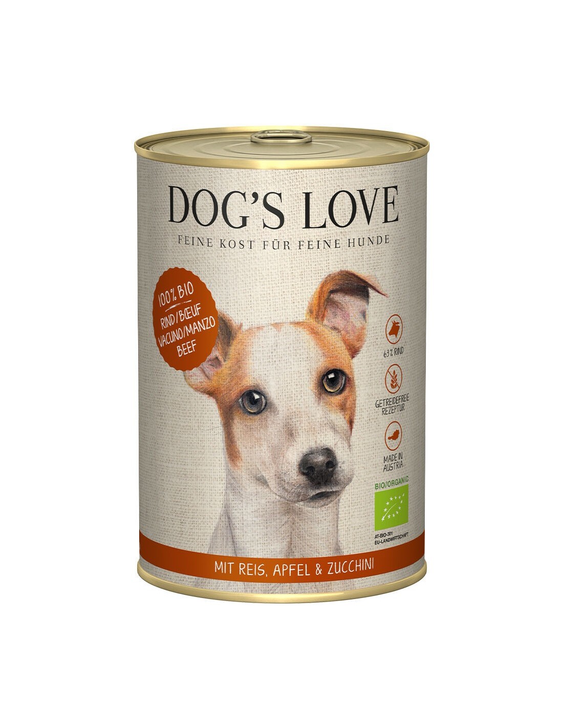 COMPOSICIÓN: vacuno bío 63 % (carne 42 %, corazón 21 %), arroz bío 10 %, calabacines bío 8 %, tomates bío 7 %, manzanas bío 7 %, minerales, algas marinas, aceite de colza bío.