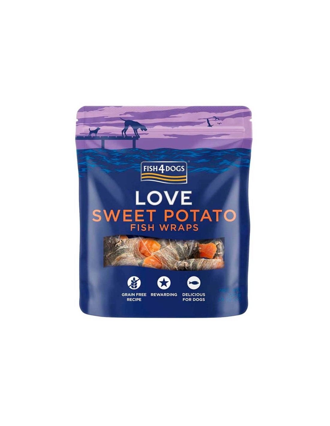 Las Fish4dogs Wraps Sweet Potato están hechas de patata dulce envuelta en piel de pescado. La patata dulce es baja en calorías (un promedio de 7 calorías por unidad) y rico en potasio y vitamina A. Son un acompañamiento ideal para el pescado, ya que son deliciosas y saludables. Al estar hechas de pescado 100% natural y patata, son el premio ideal para su perro, incluso si es alérgico al gluten o tiene problemas dermatológicos.