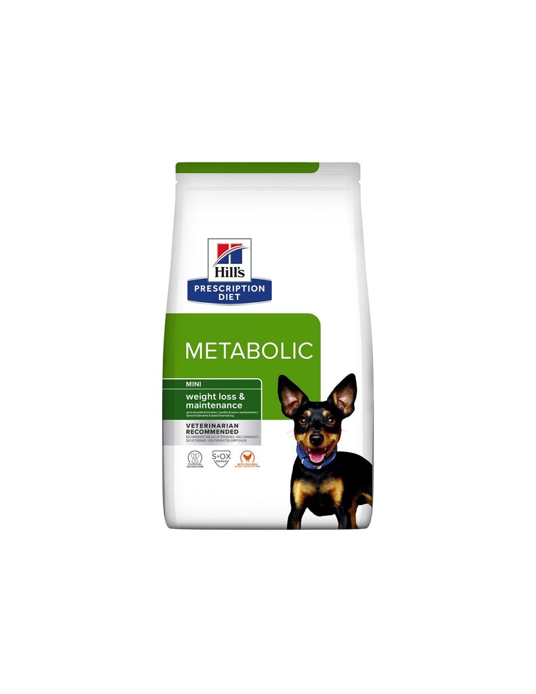Hill's Canine Prescription Diet Metabolic Mini pienso completo bajo en energía para la alimentación diaria de perros adultos de raza mini obesos que necesitan bajar de peso o mantenerse en su peso después de una dieta de adelgazamiento. Esta dieta consigue modificar el metabolismo de cada animal, activando la capacidad natural del organismo para quemar el exceso de grasas y el uso de las calorias.