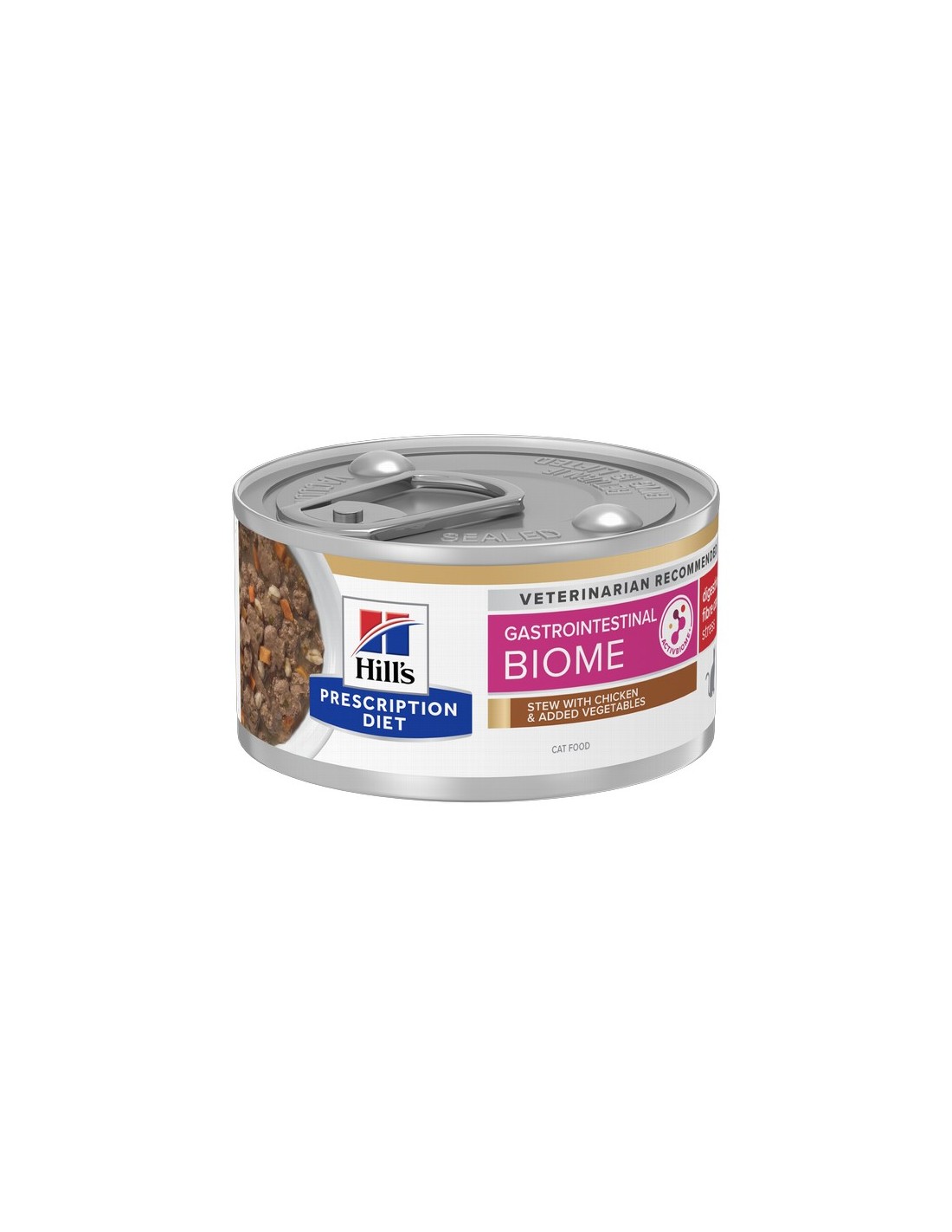 Hills Prescription Diet Gastrointestinal Biome Stress alimento húmedo para gatos es una deliciosa nutrición con una fórmula exclusiva que ayuda a reducir el estrés en gatos con molestias digestivas. Nutrición clínica formulada con fibra alta para promover unas heces regulares y saludables en tan solo 24 horas. Con tecnología ActivBiome+, que nutre rápidamente al microbioma intestinal y ayuda a controlar problemas gastrointestinales complejos. Elaborado con ingredientes para reducir el estrés.