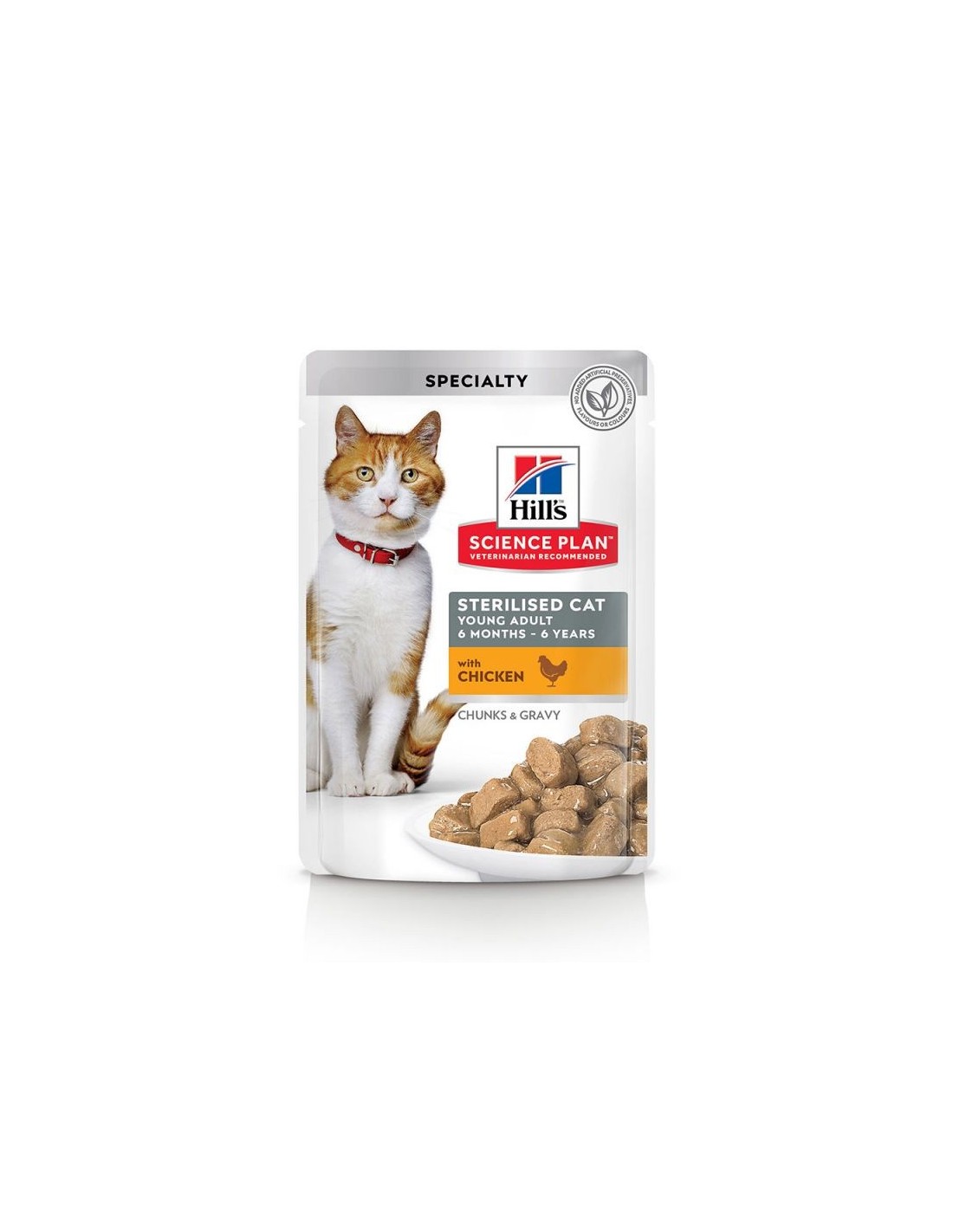 Hill's Young Adult Sterilised es una comida húmeda equilibrada y baja en grasas que está especialmente desarrollada para las necesidades de los gatos jóvenes esterilizados.