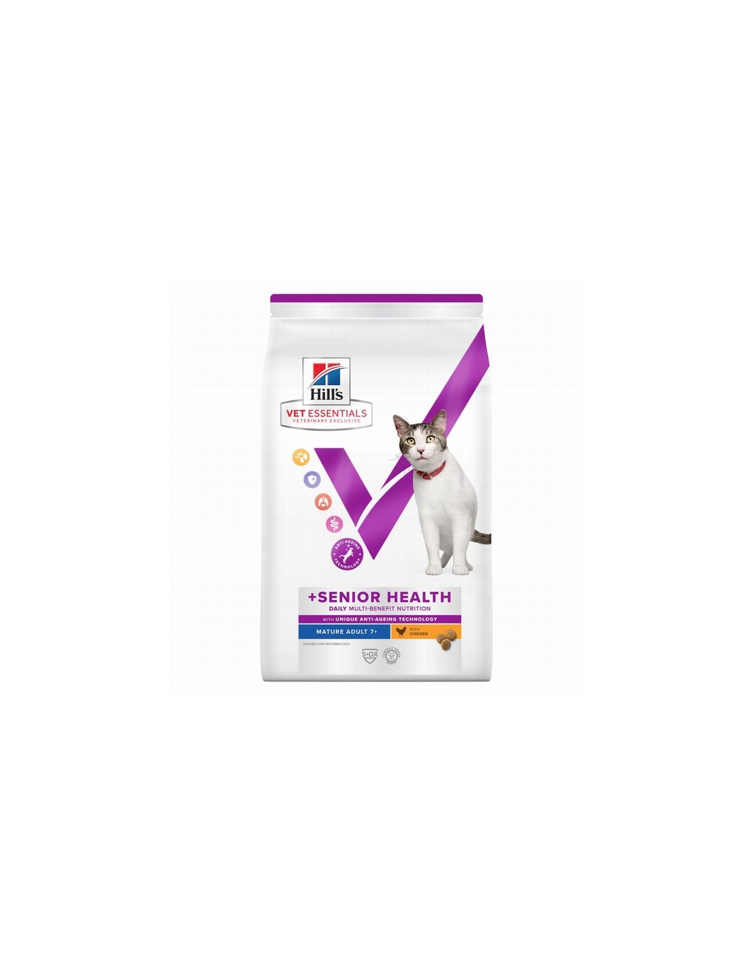 Hill's Vet Essentials Multi-Benefit +Senior Health alimento para gatos mayores con pollo (para gatos de más de 7 años) es la fórmula de Hills más avanzada, disponible exclusivamente en clínicas veterinarias, para gatos mayores, diseñada para mejorar su calidad de vida.