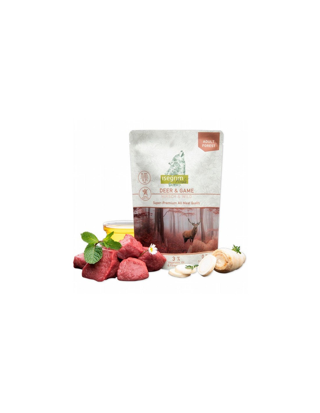 Inspirada en los terrenos en los que se alimentaban los perros ancestrales, este menú combina un sabroso venado y gamo con raíz de perejil. Especialmente rica en vitamina C y con un toque de hierbas
