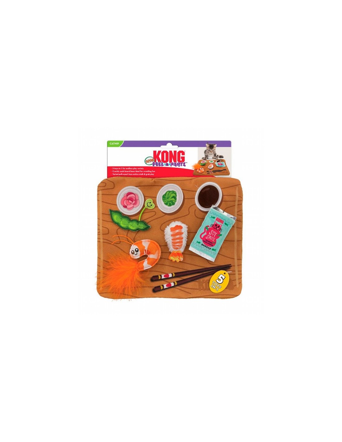 Tirar del edamame, del camarón y de la salsa de soja de los parches con velcro satisface los instintos de desmantelamiento, mientras que cada juguete ligero para batear motiva el juego con ayuda de la hierba gatera KONG Premium North American Catnip en su interior, prolongando la acción.