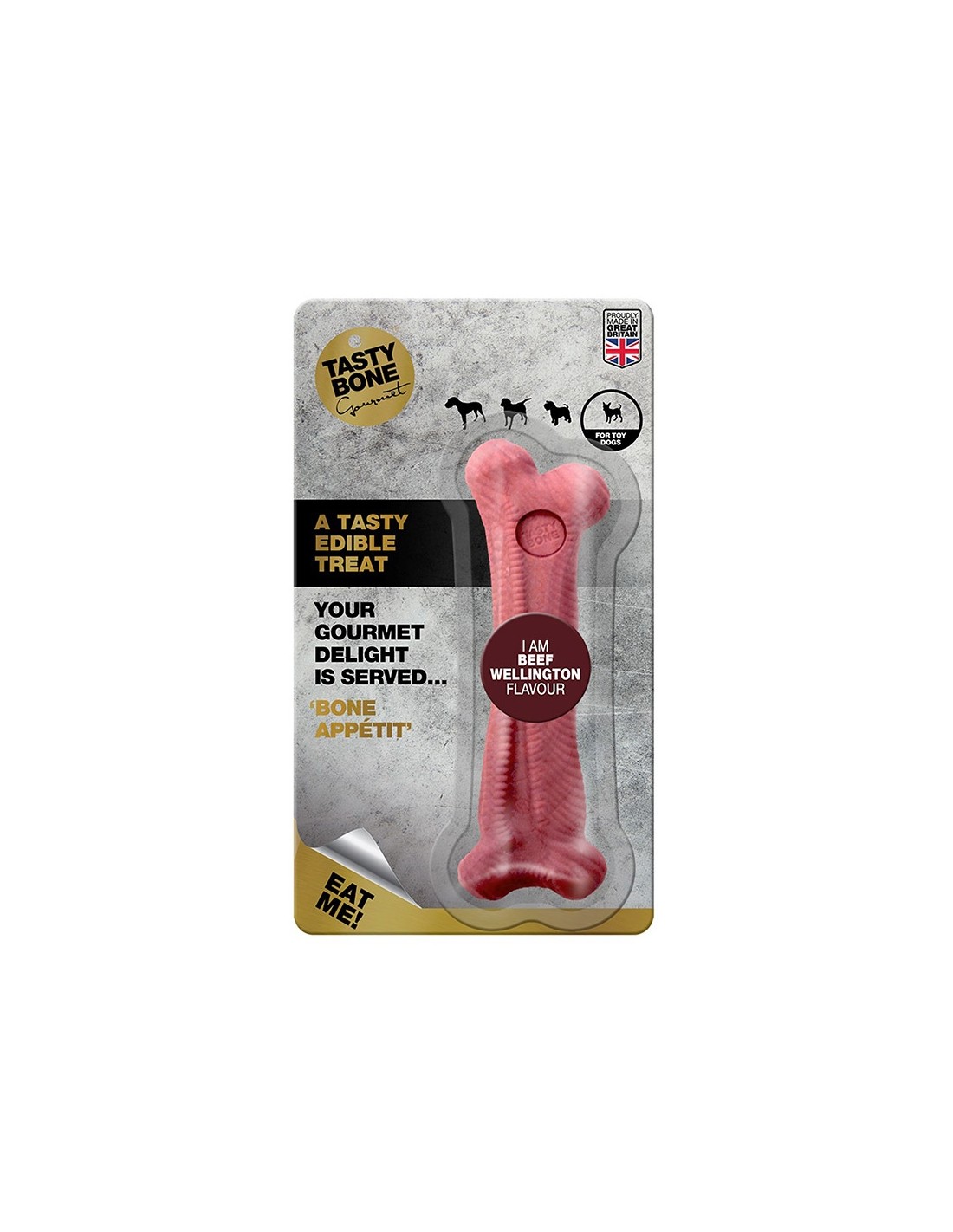 Un sabroso manjar comestible. Diseñada para satisfacer las necesidades de masticación de su perro, la gama de huesos Gourmet es similar a una galleta fuerte, por lo que se adapta mejor a una masticadora suave. ¡También es una sabrosa alternativa a tus muebles! Este hueso tiene un delicioso sabor a Beef Wellington y está diseñado para perros pequeños.