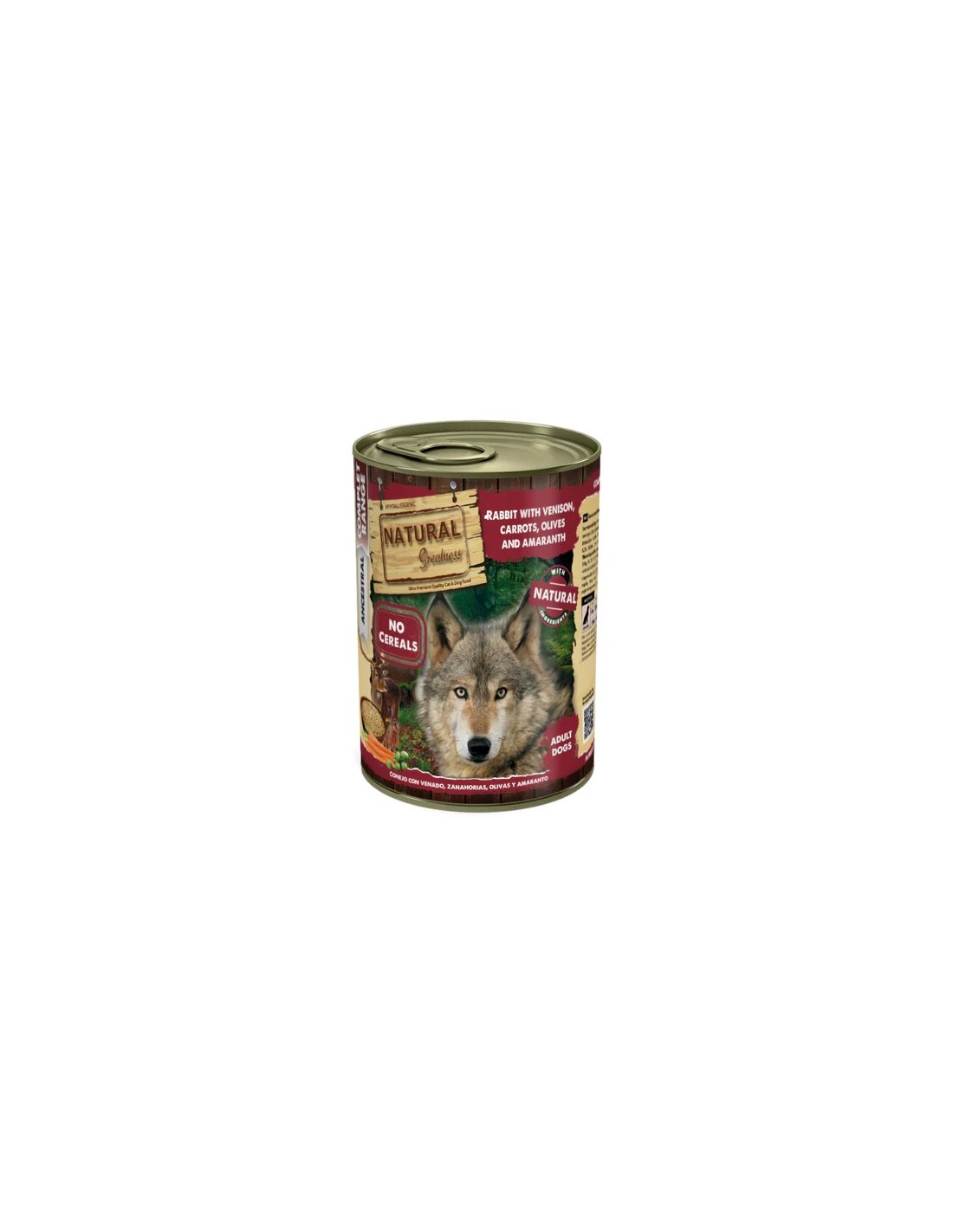 Deliciosa lata de Natural Greatness con un sabor muy variado: conejo, pollo y ciervo con zanahorias.