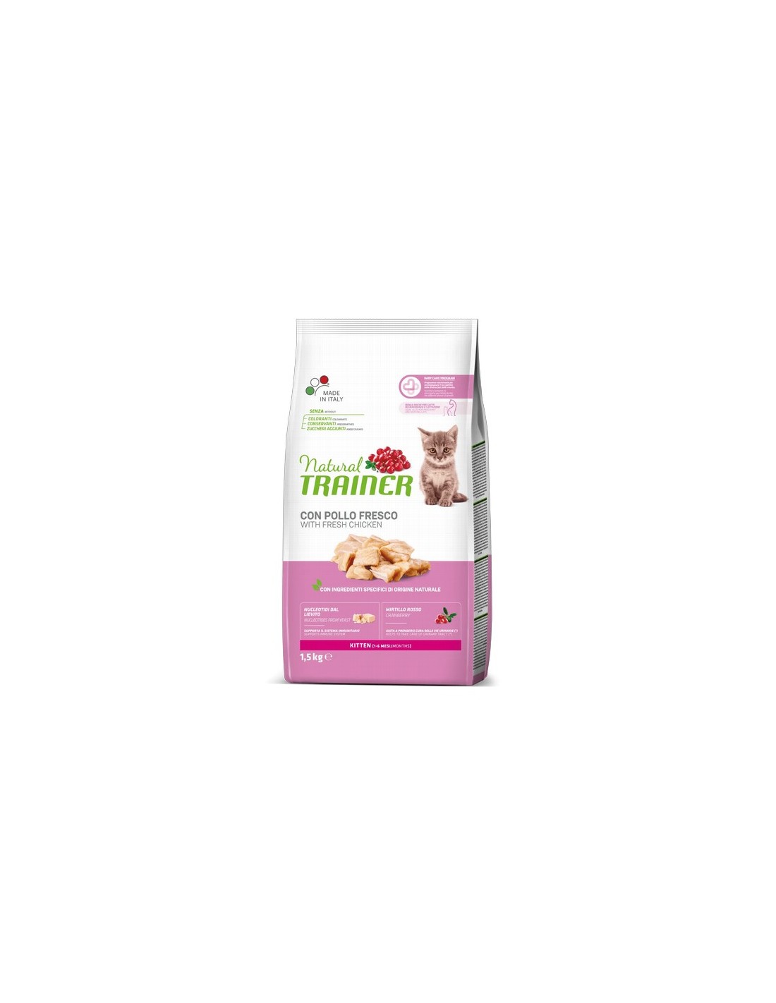 Natural Trainer Kitten & Young está diseñado para satisfacer las necesidades específicas de los gatitos en sus primeros doce meses de vida. Su rica receta contribuye a garantizar que tu gatito tenga todo lo que necesita durante su primer año de vida. El extracto de arándano rojo que contiene es rico en antioxidantes.