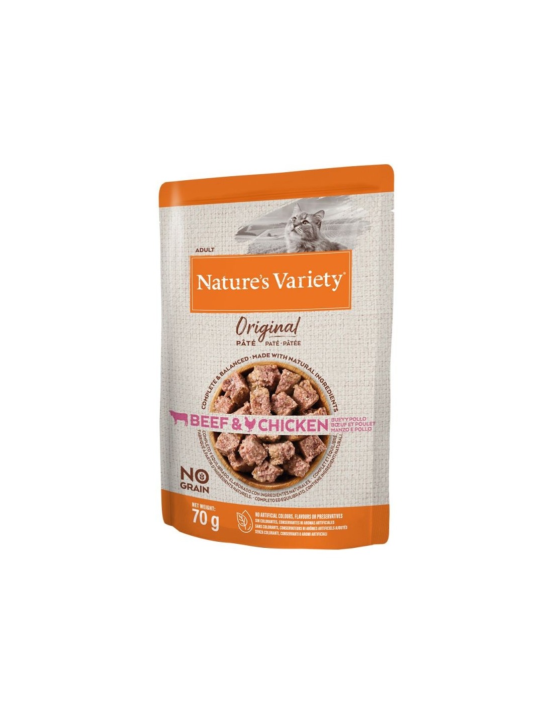 Alimento completo y equilibrado para gatos adultos , sin cereales.Con pollo y buey de alta calidad como ingrediente principal. Cocido al vapor a temperatura óptima en sus propios jugos para preservar mejor los nutrientes.