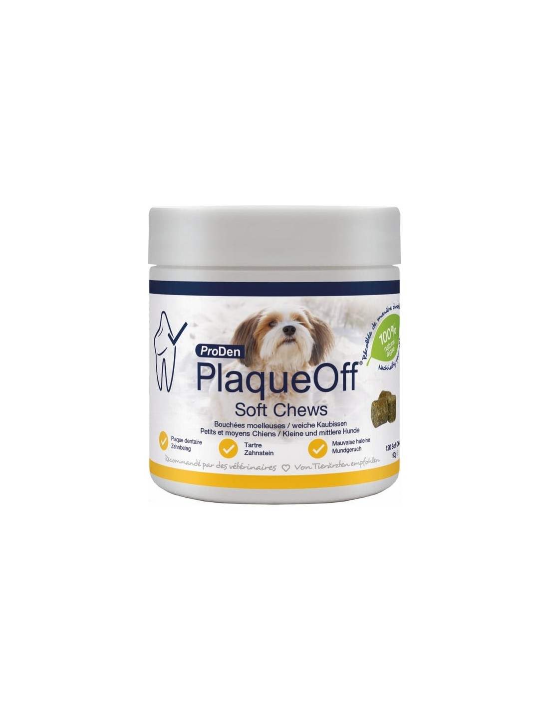 Muchos perros y gatos sufren problemas de salud bucodental. Una buena higiene bucal es esencial para su bienestar. Los nuevos PlaqueOff ProDen Soft Chews para perros combinan los excepcionales beneficios que tienen para la higiene bucodental, con el placer que proporciona un premio delicioso. Gracias a su formulación única, estos bocaditos masticables ayudan a combatir la placa y los depósitos de sarro, refrescan el aliento y mejoran la salud de dientes y encías.