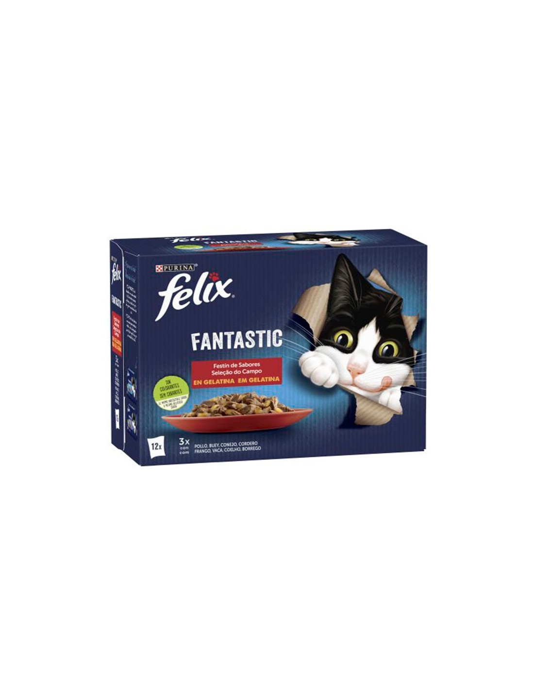 Felix Fantastic Festín de carnes en gelatina se compone de 4 recetas exquisitas hechas con diferentes carnes en tiernos y jugosos trocitos. Los ingredientes son cuidadosamente partidos y cocinados en una suculenta gelatina para que tu gato disfrute de un plato delicioso cada día.
