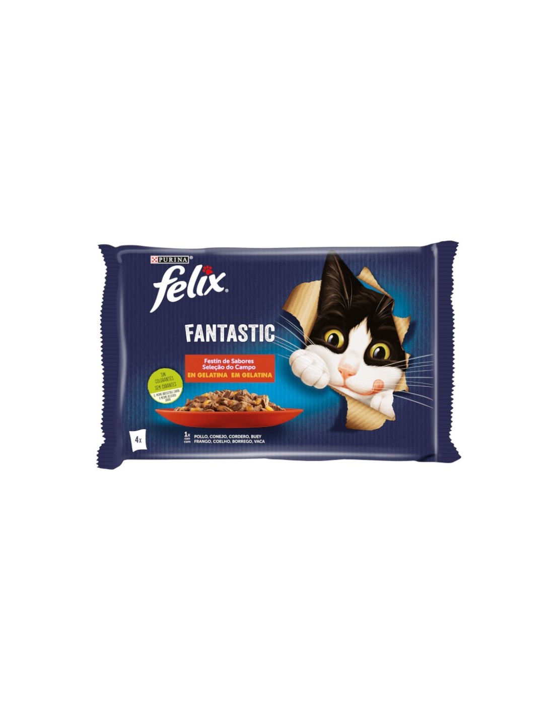 Felix Fantastic Festín de carnes en gelatina se compone de 4 recetas exquisitas hechas con diferentes carnes en tiernos y jugosos trocitos. Los ingredientes son cuidadosamente partidos y cocinados en una suculenta gelatina para que tu gato disfrute de un plato delicioso cada día.