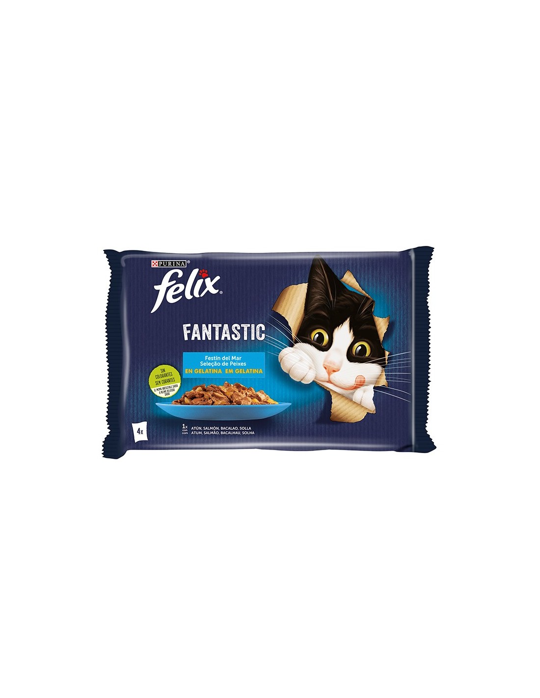 Felix Fantastic Festín del Mar en gelatina se compone de 4 recetas exquisitas hechas con diferentes pescados en tiernos y jugosos trocitos. Los ingredientes son cuidadosamente partidos y cocinados en una suculenta gelatina para que tu gato disfrute de un plato delicioso cada día.