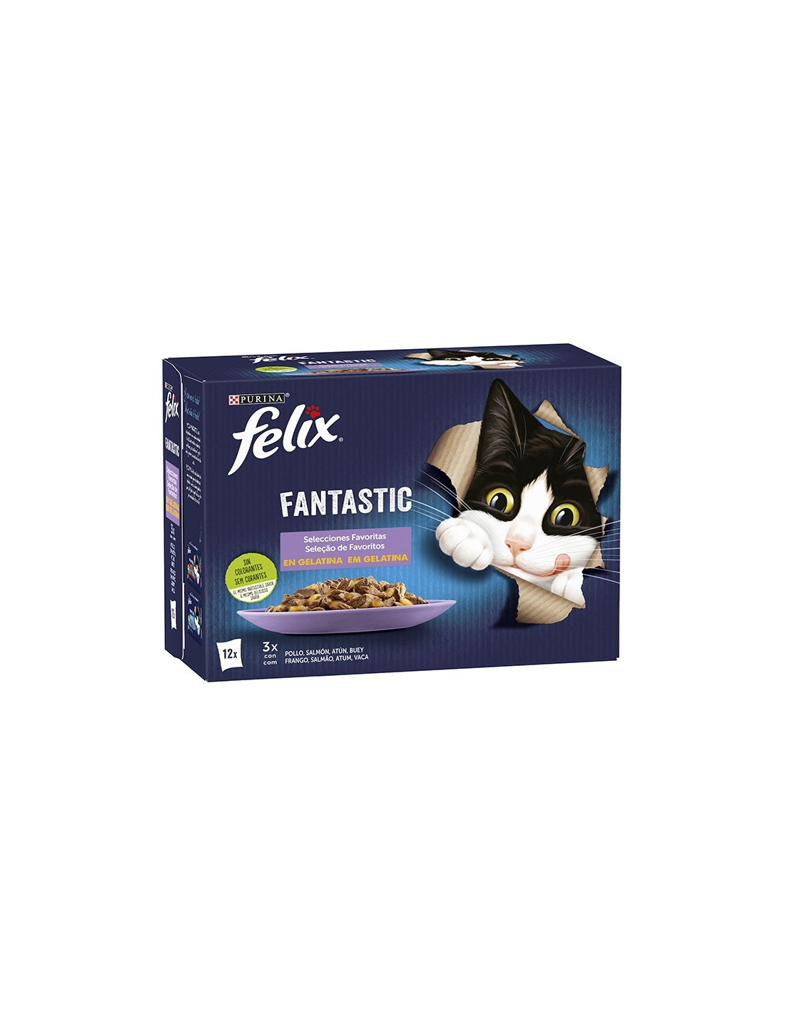 Felix Fantastic Selecciones Favoritas de carnes y pescados en gelatina se compone de 4 recetas exquisitas hechas con diferentes carnes y pescados en tiernos y jugosos trocitos. Los ingredientes son cuidadosamente partidos y cocinados en una suculenta gelatina para que tu gato disfrute de un plato delicioso cada día.