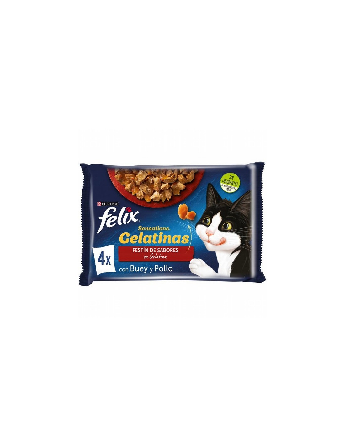 Felix Sensations Gelatinas selección con buey o pollo, es un alimento húmedo para gatos que satisface su sofisticado paladar gracias a su textura y su sabor irresistibles. El pack se compone de dos recetas diferentes hechas con ricos trozos de carne servidos en una deliciosa salsa de gelatina.