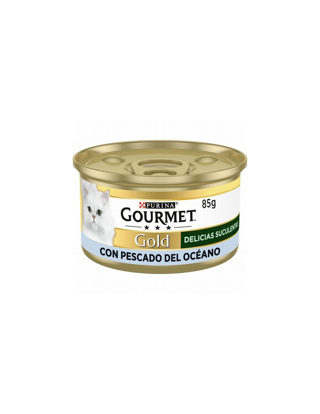 PURINA® GOURMET® Gold Delicias Suculentas en lata de 85g. Comida húmeda para gato con Pescado del Océano. Refinados cortes jugosos y suculentos.