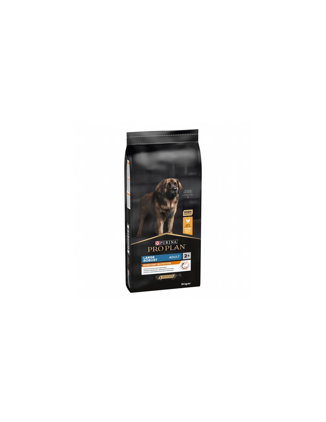 Pro Plan Adult Large Robust ha sido especialmente formulado para perros grandes con físico robusto. Contiene una combinación especial de L-carnitina y niveles óptimos de proteínas y grasas para mantener una masa corporal magra. Se ha agregado también un alto porcentaje de glutamina proveniente de la carne para ayudar a proteger el delicado sistema digestivo de estas razas grandes. Los ingredientes principales son pollo de primera calidad y arroz de alta digestibilidad, que proporcionan una nutrición completa para tu perro y lo protegen durante toda su vida.