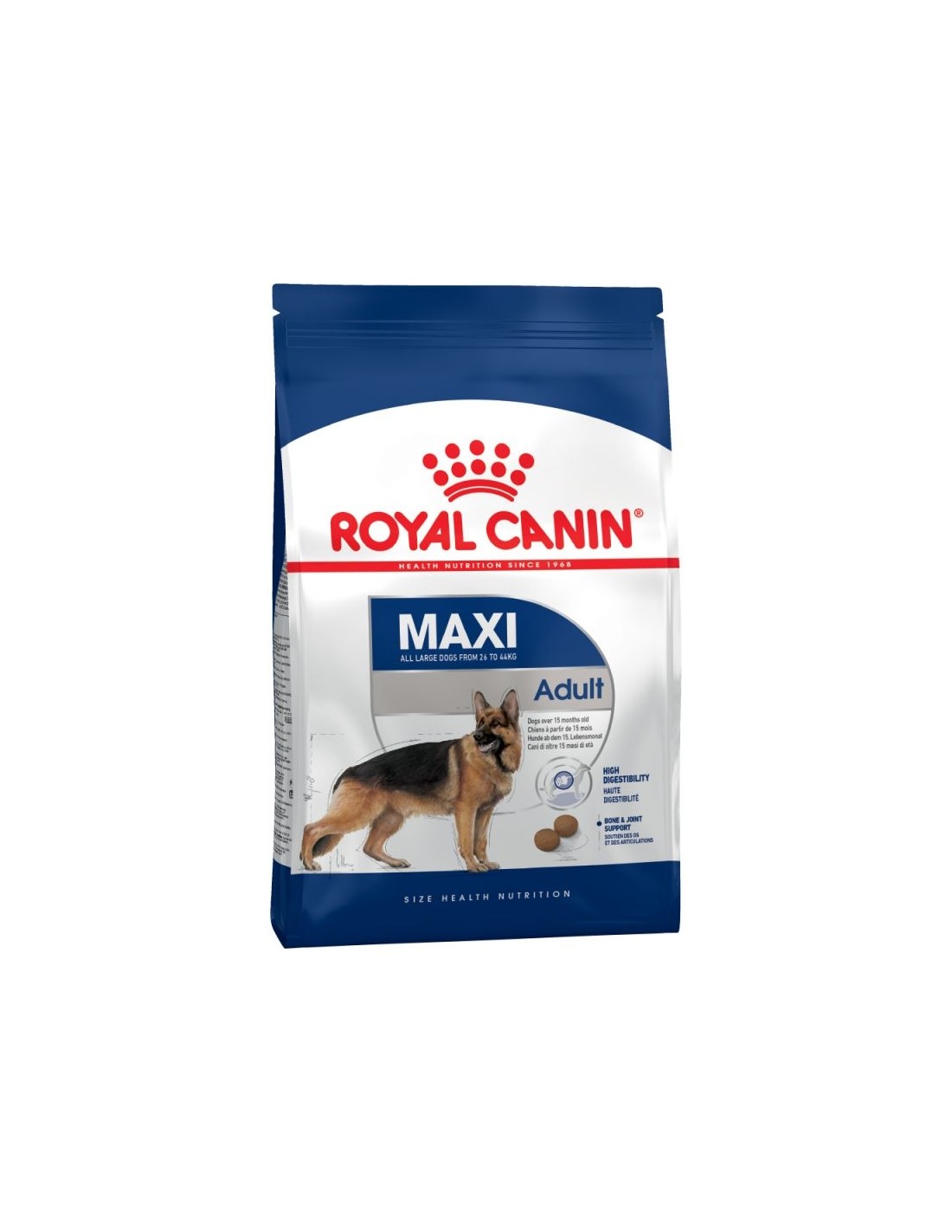Royal Canin Maxi Adult pienso para perros desde los 15 meses hasta los 5 años. Facilita el tránsito intestinal, protege las articulaciones y contiene taurina para el buen funcionamiento del corazón para perros de 26 a 44 kg, desde los 15 meses a los 5 años; que ayudará a tu mascota a mantener el peso ideal y un óptimo estado de salud.