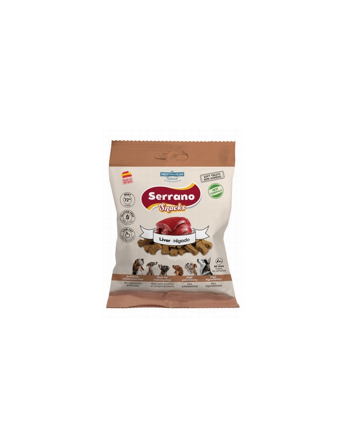 Los Serrano Snacks de MEDITERRANEAN NATURAL, delicadamente cortados en pequeñas cantidades con forma de huesito, garantizan la seguridad de la mascota, mantienen su pureza y todos los nutrientes, reflejan la dieta natural y contienen un 70 % de carne fresca.