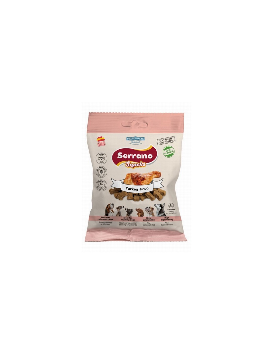Los Serrano Snacks de MEDITERRANEAN NATURAL, delicadamente cortados en pequeñas cantidades con forma de huesito, garantizan la seguridad de la mascota, mantienen su pureza y todos los nutrientes, reflejan la dieta natural y contienen un 70 % de carne fresca.