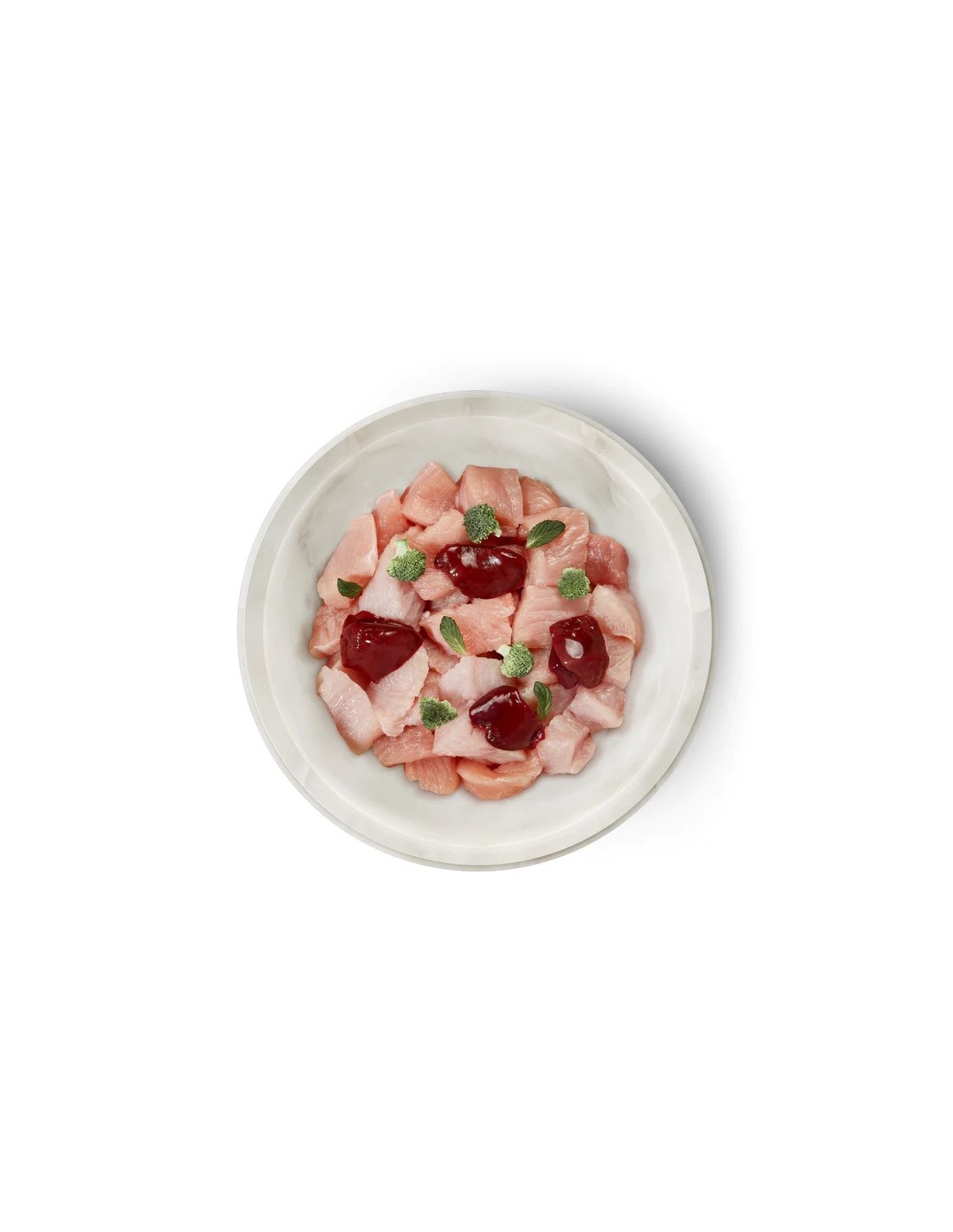 Corazón de pavo (49%), hígado de pavo (17%), piel de pavo (14%), carne muscular de pavo (10%), brócoli (4%), tomate en polvo, aceite de colza, alga marina*, hierba gatera*, minerales