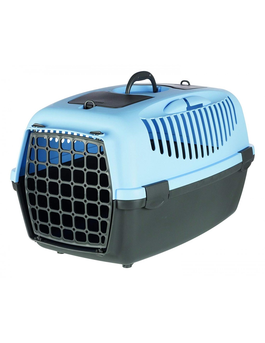Transportín de plástico rígido con puerta de rejilla de plástico resistente.