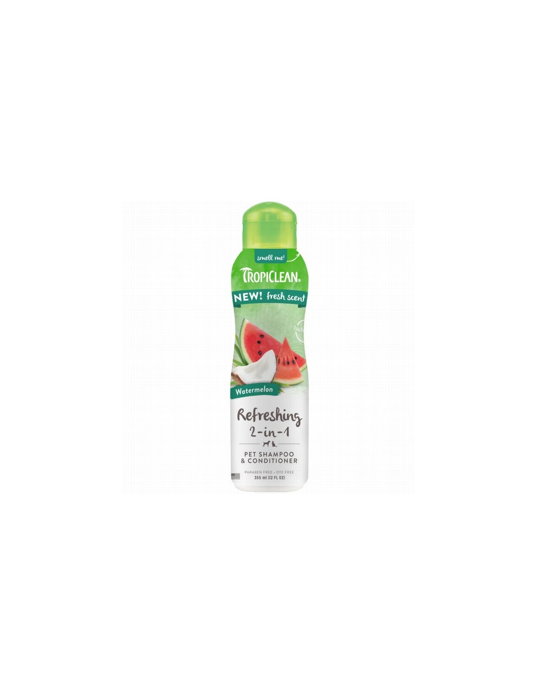Champú y Acondicionador 2 en 1 TropiClean Watermelon Refresh, una solución de baño refrescante y conveniente para el cuidado del pelaje de tu mascota. Esta fórmula combina las propiedades de un champú limpiador con las de un acondicionador suavizante, dejando el pelaje limpio, suave y con un agradable aroma a sandía.