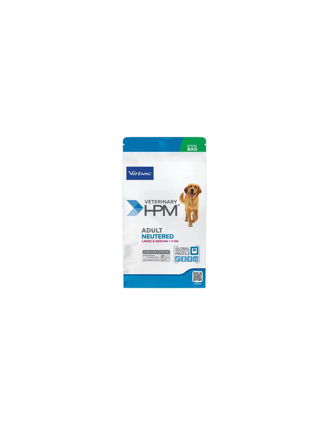 Veterinary HPM Adult Neutered Dog Large & Medium es una dieta completa para perros adultos esterilizados (o con tendencia a ganar peso) para razas grandes (> 25 kg) a partir de los 18 meses y medianas (10-25 kg) a partir de los 12 meses.