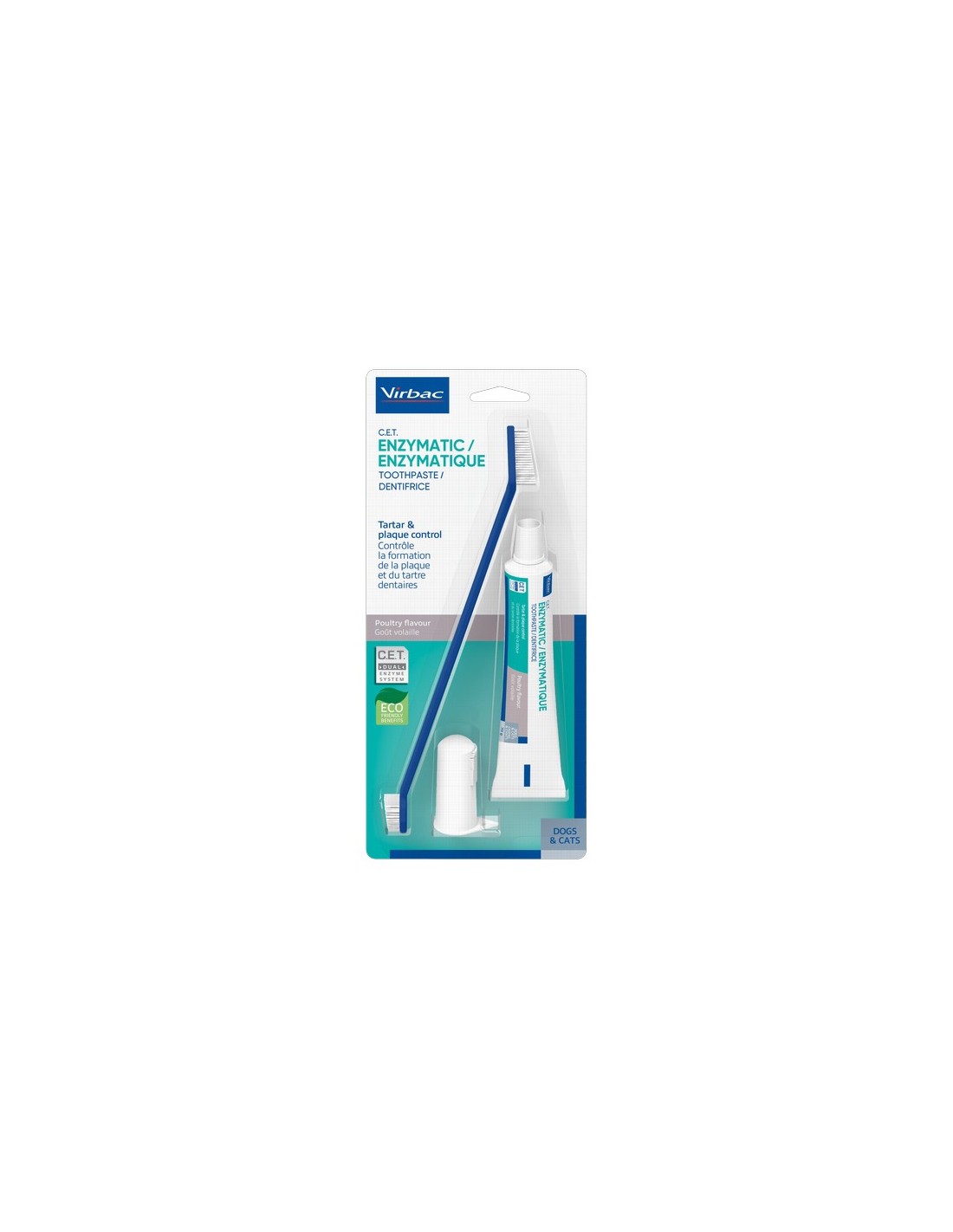 Virbac CET Pasta Enzimatica de dientes para perros y gatos C.E.T. de uso diario, está especialmente formulada para controlar las bacterias y reducir la formación de placa. Kit completo de higiene bucal para perros y gatos. Incluye cepillo dental de dedo, cepillo de dientes para perros y gatos C.E.T. de doble cabezal, y pasta de dientes C.E.T. con tecnología enzimática dual.