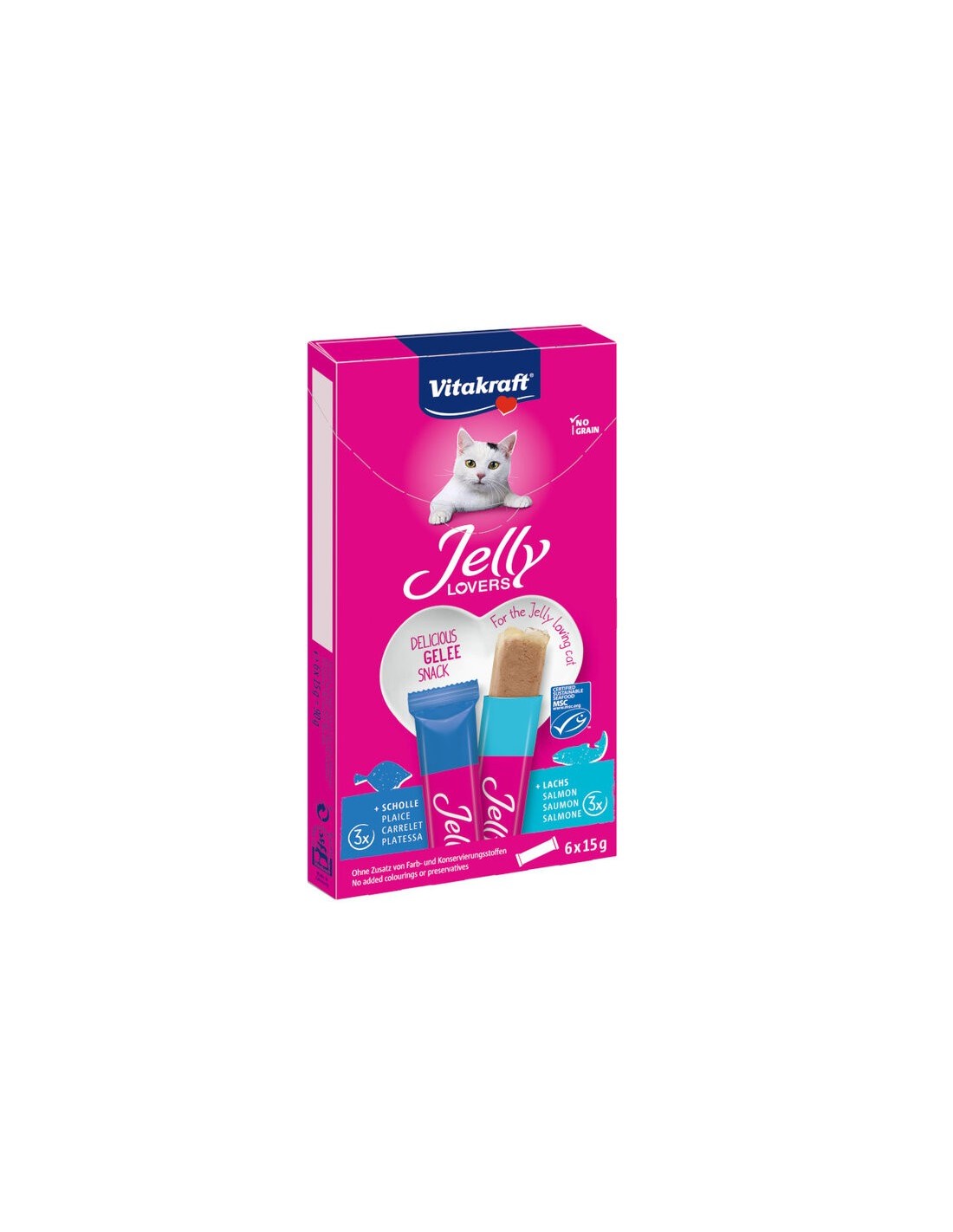 Vitakraft Gato snacks de gelatina con Salmón Y que aportan una deliciosa variedad. Este alimento complementario para gatos no contiene cereales, azúcares añadidos, colorantes ni conservantes. Puedes darle la gelatina a tu gato directamente del envase o como topping sobre la comida principal. Sea como sea, la disfrutará a tope.