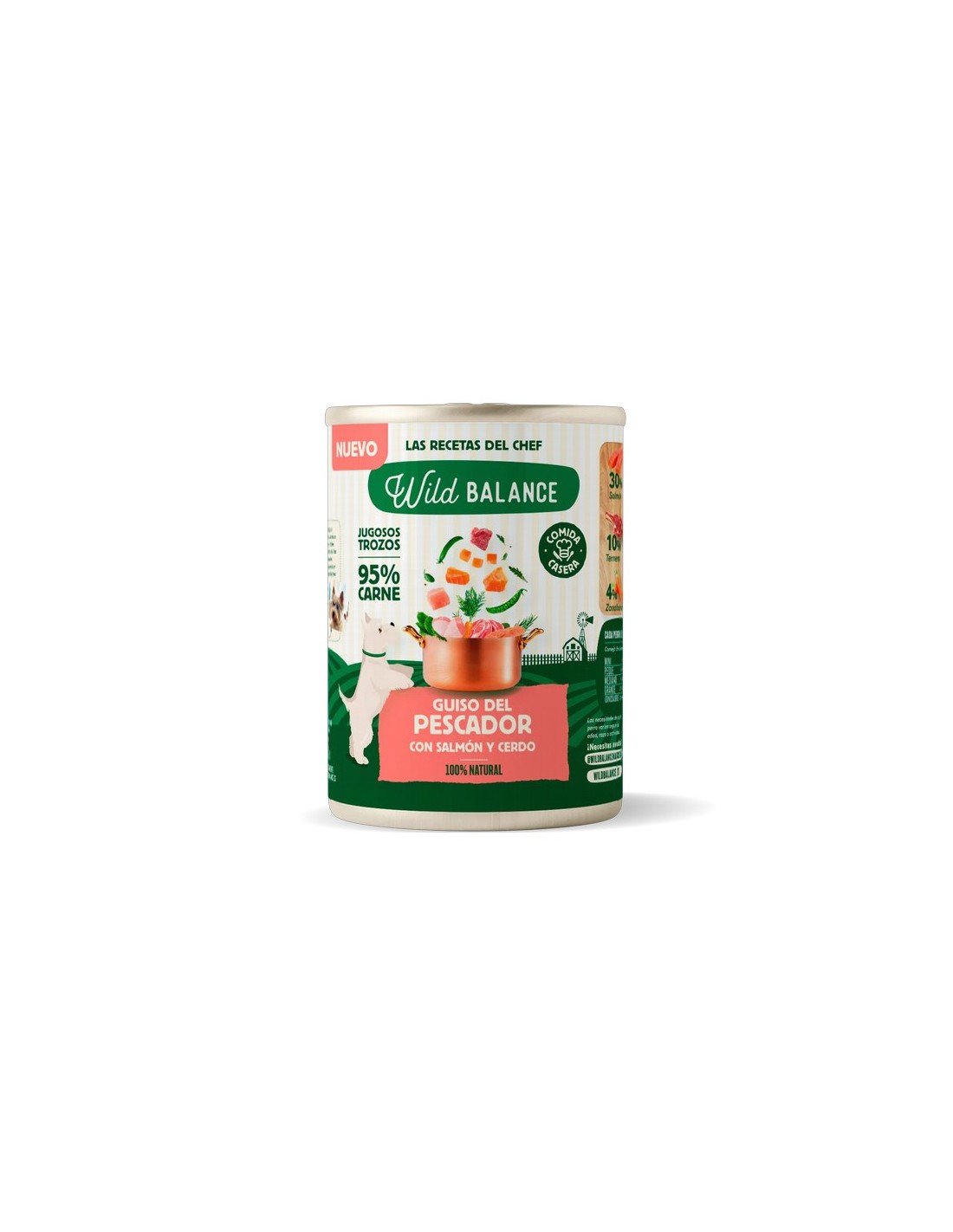 En Wild Balance somos conscientes de la importancia que tiene la alimentación para nuestros perros, por ello, todas nuestras latas contienen ingredientes de calidad, con un alto porcentaje de carne y verduras (50% pollo, 30% salmón, 10% ternera, 5% cerdo, 4% zanahoria y 1% guisantes). Cocinados a fuego lento y con mucho amor. ¡Tu perro no podrá resistirse a este festín de recetas del chef!