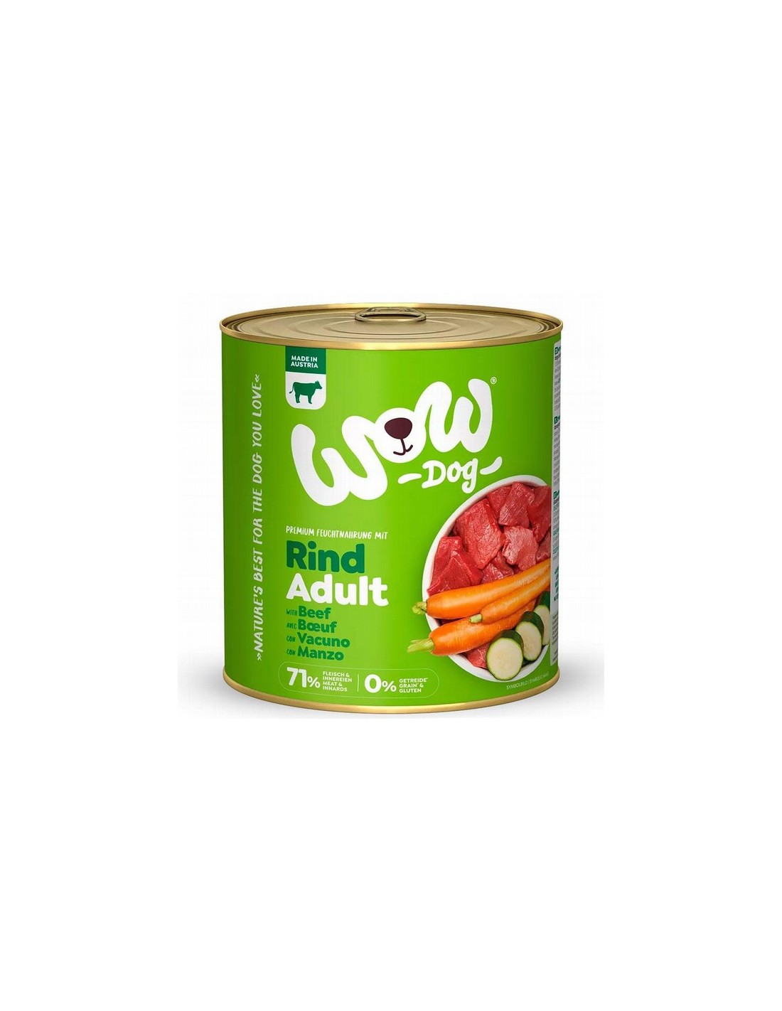 Composición: carne y vísceras 71% (el 51,5% de vacuno (pulmón de vacuno 31,5%, riñón de vacuno 8%, corazón de vacuno 6%, hígado de vacuno 6%), carne de pollo 19,5%), zanahorias 2%, minerales, calabacín 0,5%, aceite de lino, cáscara de huevo molida, algas marinas 0,1%, hojas de ortiga, hojas de diente de león