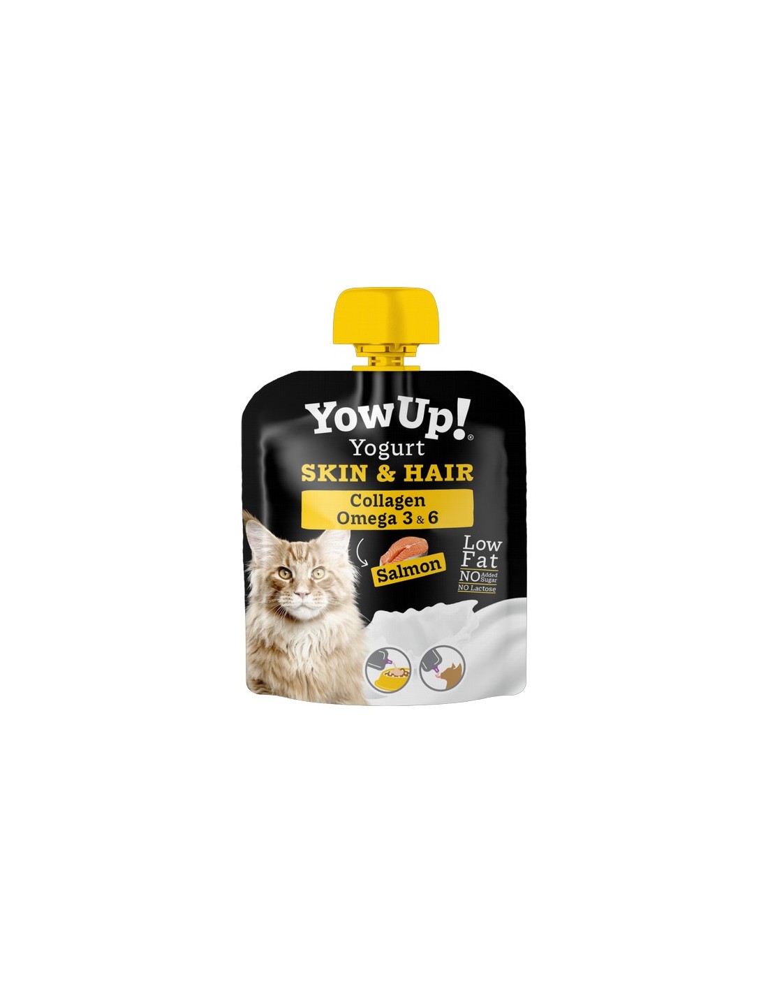 Composición: Productos lácteos fermentados (Yogur sin lactosa) 87%, almidón de maíz 3,5%, aceite de pescado 3,5%, salmón 3%, pectina 1%, colágeno bovino 0,5%, oligofructosa seca 0,5% y cúrcuma longa 0,01%.