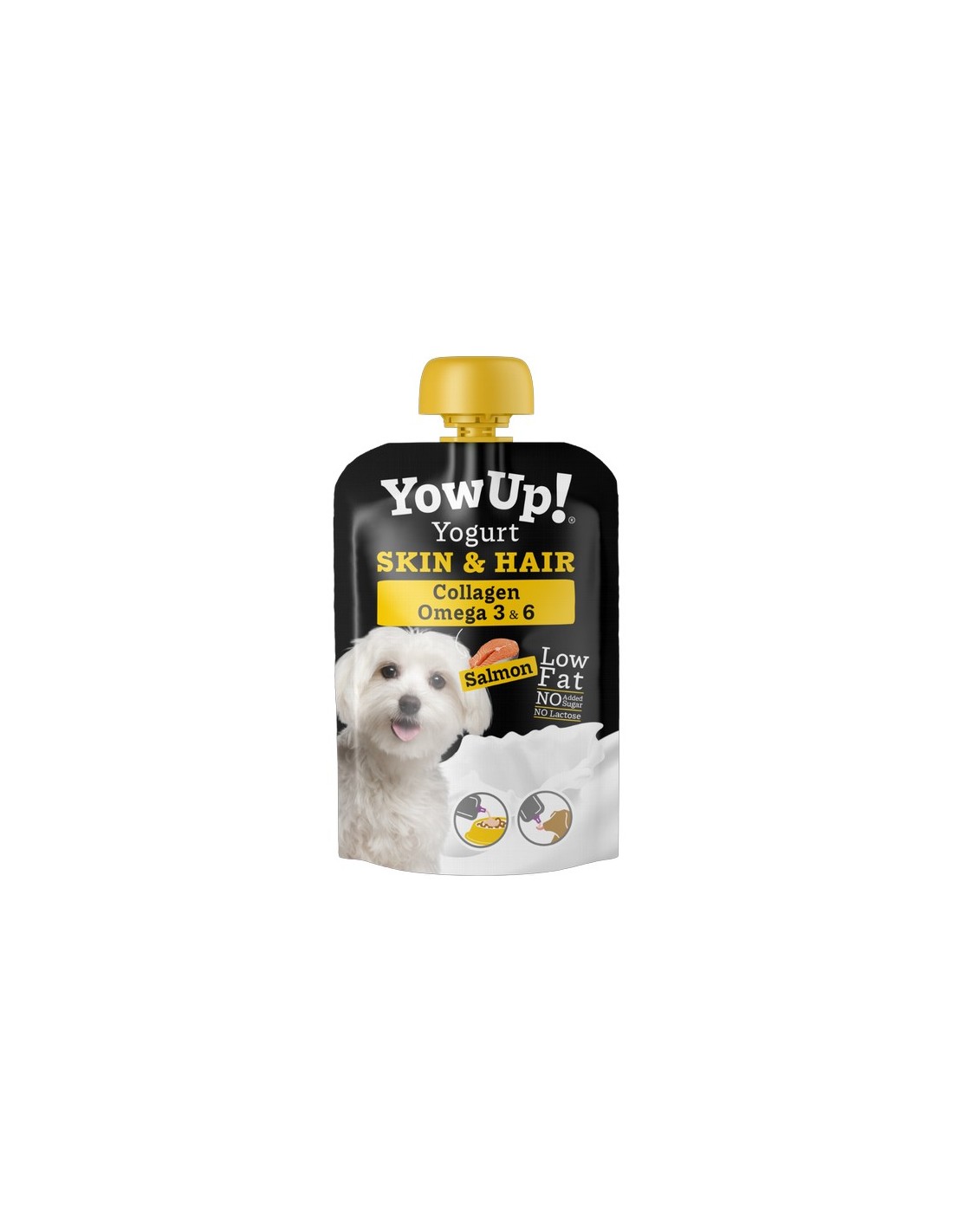 Composición: Productos lácteos fermentados (Yogur sin lactosa) 87%, almidón de maíz 3,5%, aceite de pescado 3,5%, salmón 3%, pectina 1%, colágeno bovino 0,5%, oligofructosa seca 0,5% y cúrcuma longa 0,01%.